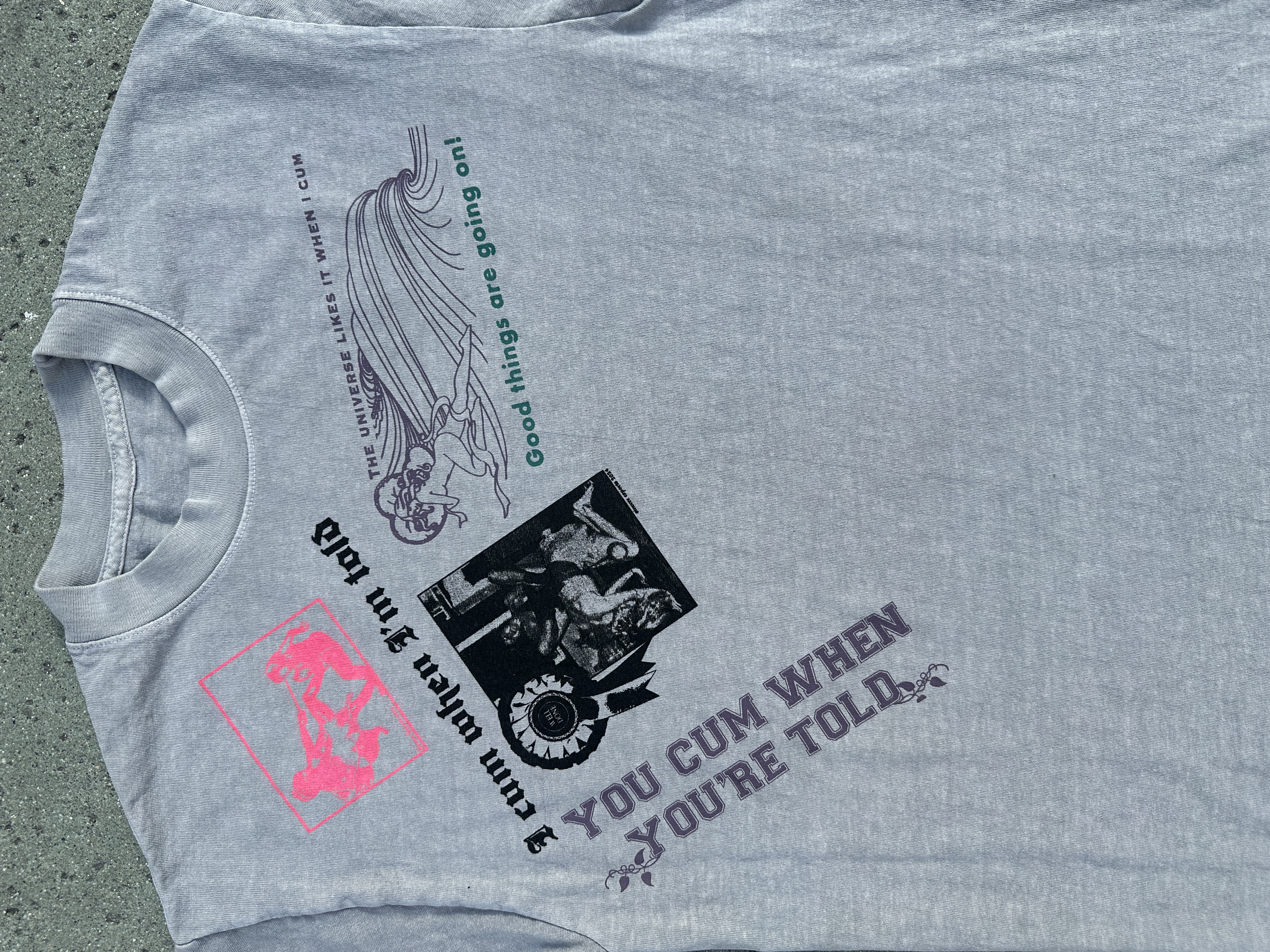 Limited edition multi-screen print on cozy gray garment dyed tees